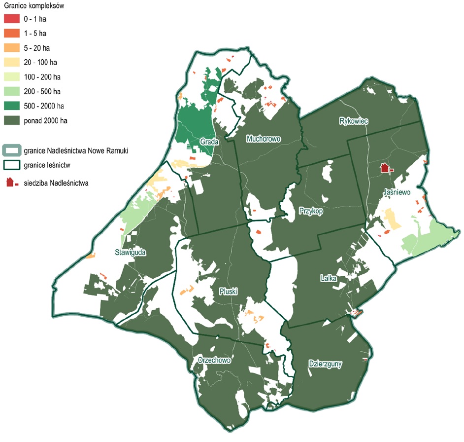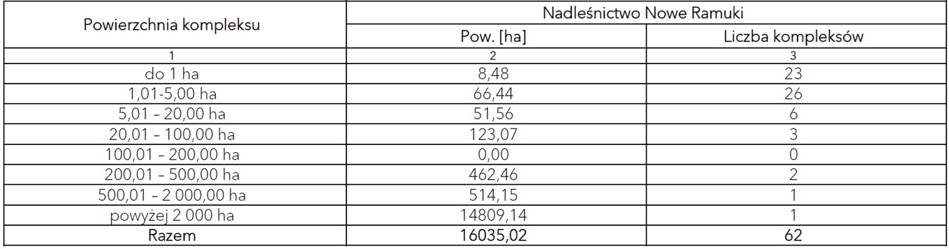 Tab. 1 Liczba i wielkość kompleksów leśnych na terenie Nadleśnictwa Nowe Ramuki (na podstawie analiz geometrycznych)
