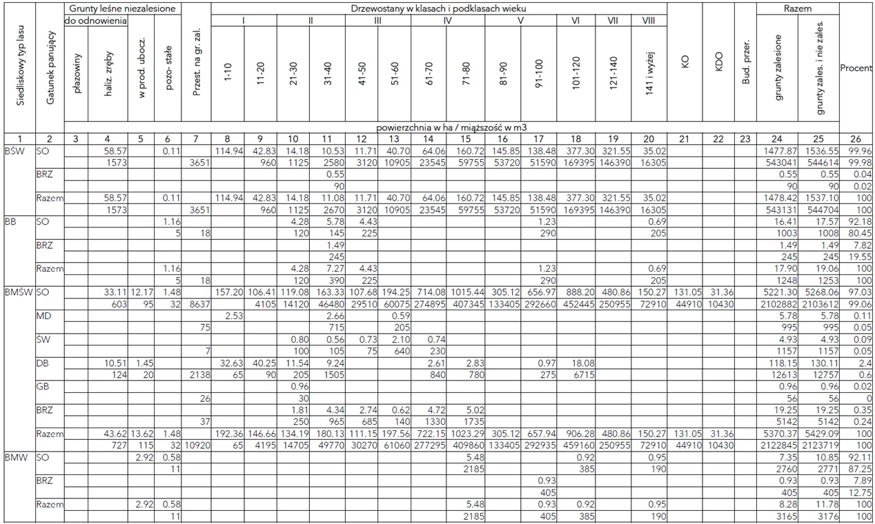 Powierzchniowa i miąższościowa tabela klas wieku wg typów siedliskowych i gatunków panujących